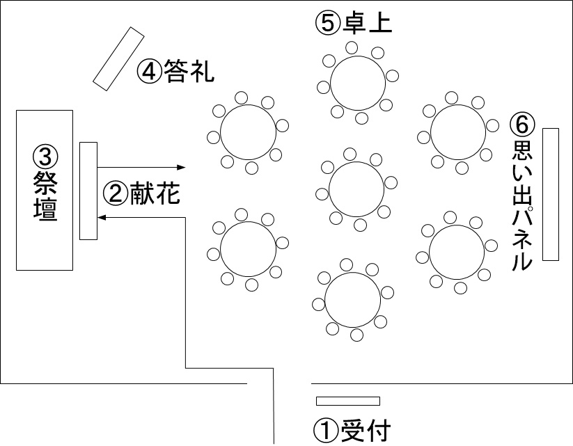 ご招待する方へは葬儀の変わりとして来ていただく為、 会場(ホテル)の空き次第で1、2週間ですぐに行われる場合と、 1ヶ月~2ヶ月間しっかりと時間をとって、ご家族で思い出の演出等用意をされる場合がございます。